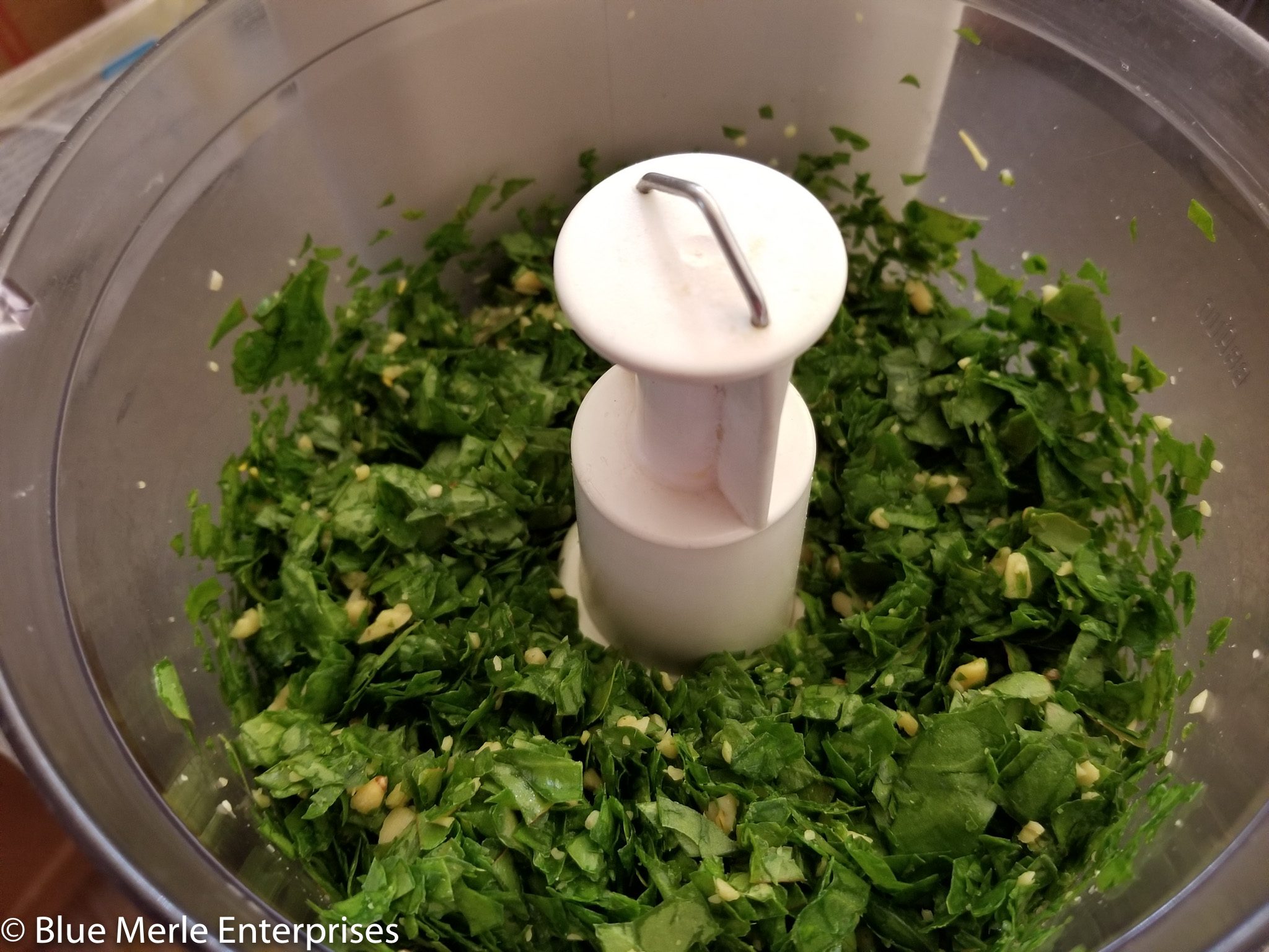 - Pulse the food processor several times, just enough to mix the nuts and finely chop the leaves.